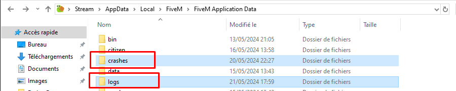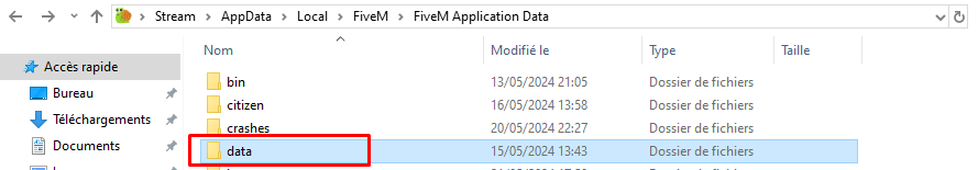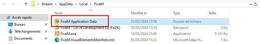 Allez dans le dossier « FiveM Application Data » (celui avec l'icône d'un escargot vert et orange). Sinon, allez à l'aide de l'explorateur Windows sur le chemin suivant : "C:\Users[nom d'utilisateur]\AppData\Local\FiveM" (remplacez [nom d'utilisateur] par votre nom d'utilisateur Windows).