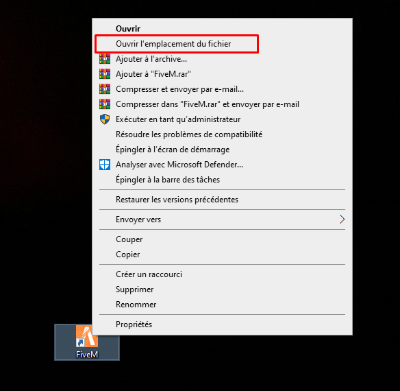 Sur l'icône FiveM sur votre bureau Windows, faites un clic droit et sélectionnez «Ouvrir l'emplacement du fichier».